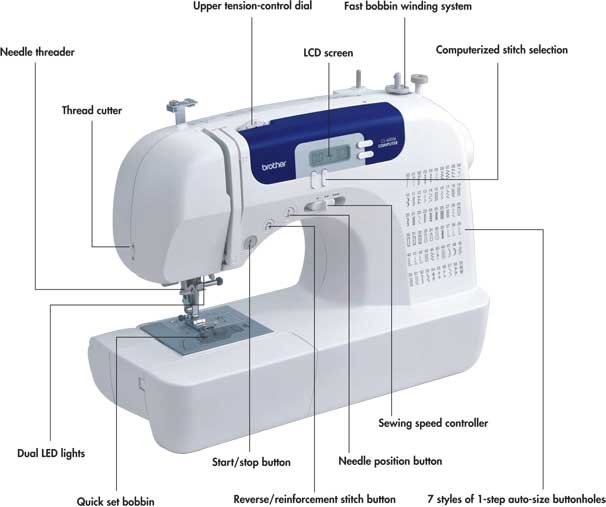 Brother CS-6000i Sewing Machine This light weight computerized sewing machine is heavy on the features that you are looking for. The CS-6000i has 60 built in stitches including, utility, decorative, heirloom, quilting and 7 styles of one step auto-sizing buttonholes. Whether you sew for crafting, garment construction, home decoration, or quilting; this machine has it all for you at an affordable price! The CS-6000i also includes a plastic fitted wide table to support your larger projects such as quilts.